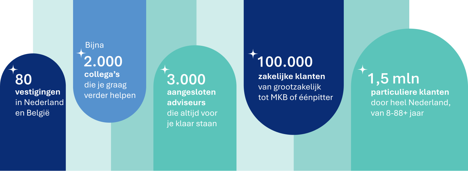 We zetten samen de optimale route uit op het vlak van financiën en verzekeringen. Voor onze particuliere en zakelijke klanten, op ieder moment. We betreden nieuwe wegen met innovatieve producten en diensten. Zo behalen we duurzaam en maatschappelijk voordeel.